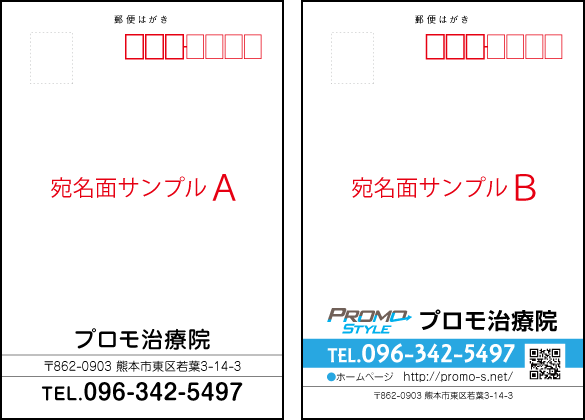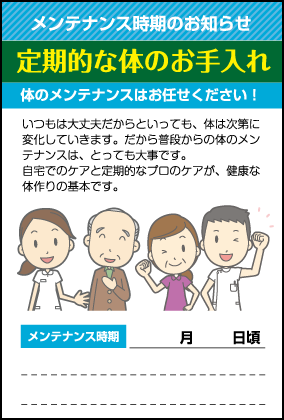 | プロモハガキを追加(2017/10/20) | H001 気になるところはありませんか? H002 メンテナンス時期のお知らせ H003 体の歪みをチェックしよう! H004 困ったときはお任せください! H005 誕生日ハガキ(1) H006 誕生日ハガキ(2) |