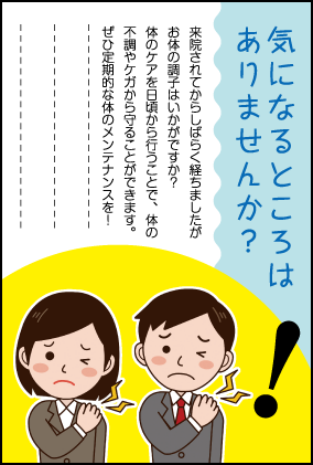 | プロモハガキを追加(2017/10/20) | H001 気になるところはありませんか? H002 メンテナンス時期のお知らせ H003 体の歪みをチェックしよう! H004 困ったときはお任せください! H005 誕生日ハガキ(1) H006 誕生日ハガキ(2) |